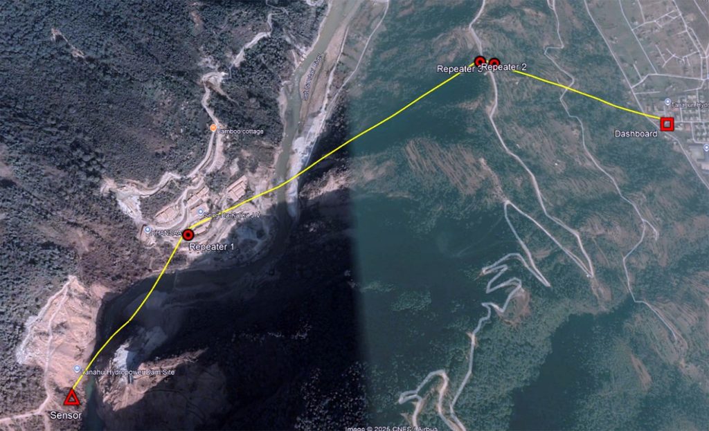 बाढी मापनसेन्सर, वायरलेस डिभाइस र साइरन राखेको क्षेत्र गुगल नक्सामा