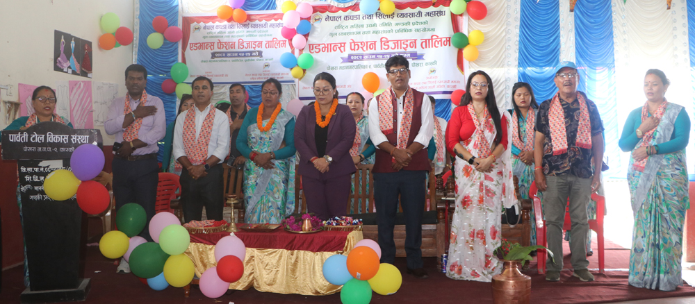 नेपाल कपडा तथा सिलाई व्यवसायी महासंघ राष्ट्रिय महिला उद्यमी समिति गण्डकी प्रदेश र नेपाल कपडा तथा सिलाई व्यवसायी संघ राष्ट्रिय महिला उद्यमी समिति कास्कीले संयुक्त रुपमा पोखरामा सञ्चालन गरेको १० दिने फेसन डिजाइन तालिममा सहभागिहरुले तयार गरेको डिजाइन प्रदर्शनी गरिदै ।