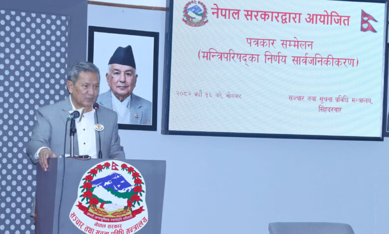 काठमाडौँ : नेपाल सरकार मन्त्रिपरिषद्को यही भदौ १३ गते बसेका बैठकका निर्णय सार्वजनिक गरिएका छन् । आज यहाँ सरकारका प्रवक्ता एवं सञ्चार तथा सूचना प्रविधिमन्त्री पृथ्वीसुब्बा गुरुङले बैठकका निर्णय सार्वजनिक गर्नुभभएको हो ।