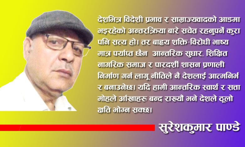देशभित्र विदेशी प्रभाव र साम्राज्यवादको आडमा भइरहेको अन्तरक्रिया बारे सचेत रहनुपर्ने कुरा पनि सत्य हो। तर बाह्य शक्ति–विरोधी भाष्य मात्र पर्याप्त छैन; आन्तरिक सुधार, शिक्षित नागरिक समाज र पारदर्शी शासन प्रणाली निर्माण गर्न लागू नीतिले नै देशलाई आत्मनिर्भर बनाउनेछ। यदि हामी आन्तरिक स्वार्थ र सत्ता मोहले आँखाहरू बन्द राख्यौं भने देशले ठूलो क्षति भोग्न सक्छ।