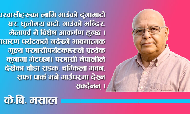 विदेशी पर्यटकहरुले नेपाललाई हिमालयन देशको रुपमा हेर्ने गर्दछन । तर विदेशी नेपालीहरुले नेपाललाई आत्माको ऐनामा हेर्दछन । तर,नेपालमा परवासी नेपालीको यात्रा फरक हुन्छ । पुख्यौली घरको ढोका ढक्ढक्याउने परवासी पर्यटकको चाहना हुन्छ । गाउँको कुलदेवताको थानमा घुँडामेरेर टाउको टेक्ने परवासी पर्यटकहरुको प्राथमिकता हुन्छ । गाउँघरको मेलापर्वमा पुर्खौली नातागोता र साथीभाईहरुलाई खोज्दै रमाउने परवासी पर्यटकहरुको भावनात्मक चाहना हुन्छ । त्यसैले परवासी पर्यटकको नेपाल आगमन केवल दृश्यावलोकन मात्र नभएर पुर्खाको मातृभूमीसँग जोडिएको हुन्छ ।