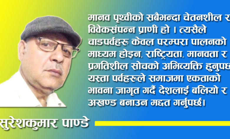 मानव पृथ्वीको सबैभन्दा चेतनशील र विवेकसंपन्न प्राणी हो । त्यसैले चाडपर्वहरू केवल परम्परा पालनको माध्यम होइन, राष्ट्रियता, मानवता र प्रगतिशील सोचको अभिव्यक्ति हुनुपर्छ। यस्ता पर्वहरूले समाजमा एकताको भावना जागृत गर्दै देशलाई बलियो र अखण्ड बनाउन मद्दत गर्नुपर्छ ।