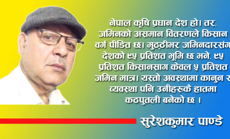 नेपाल कृषि प्रधान देश हो । तर, जमिनको असमान वितरणले किसान वर्ग पीडित छ। मुट्ठीभर जमिनदारसँग देशको ९५ प्रतिशत भूमि छ भने, ९५ प्रतिशत किसानसँग केवल ५ प्रतिशत जमिन मात्र। यस्तो अवस्थामा कानुन र व्यवस्था पनि उनीहरूकै हातमा कठपुतली बनेको छ । धार्मिक असमानता, जातीय विभेद, लैङ्गिक असमानता, भ्रष्टाचार, महँगी र अपराधजस्ता समस्याले समाजलाई ग्रसित बनाएको छ । यस्तो अवस्थामा कृषिआधारित क्रान्ति अत्यावश्यक छ। जमिन जोत्नेलाई दिने नीति कार्यान्वयन भएमा अन्न उत्पादन बढ्ने र देश आत्मनिर्भर बन्न सक्ने सम्भावना छ । तर, यस्ता क्रान्तिकारी परिवर्तन केवल माक्र्सवाद–लेनिनवाद–माओत्सेतुङ विचारमा आधारित सच्चा कम्युनिष्ट नेतृत्वमा मात्र सम्भव हुन्छ ।