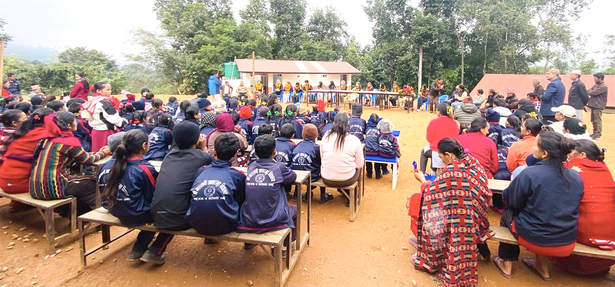 तनहुँको भानु नगरपालिका–५ बारीफाँटस्थि श्री नारायणी आधारभूत विद्यालयको नवनिर्मित भवनको उद्घाटन तथा हस्तान्तरण समारोहमा सहभागि अतिथि, शिक्षक, अभिभावक र विद्यार्थीहरु ।