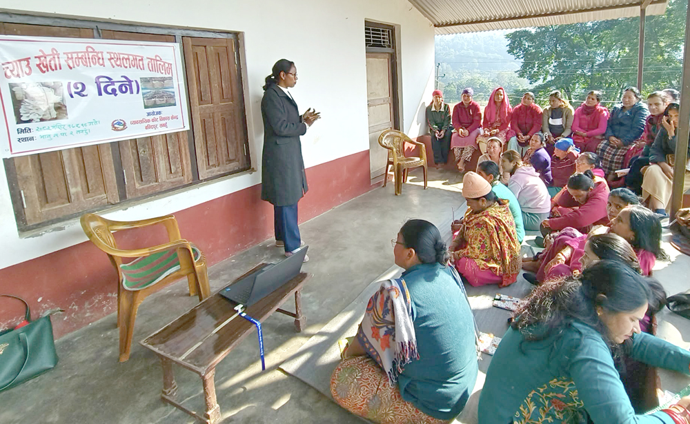 तनहुँको भानु नगरपालिका–२ का किसानहरुलाई लक्षित गरी सञ्चालन गरिएको दुई दिने च्याउ खेती सम्बन्धी स्थलगत तालिममा सहभागिहरु ।