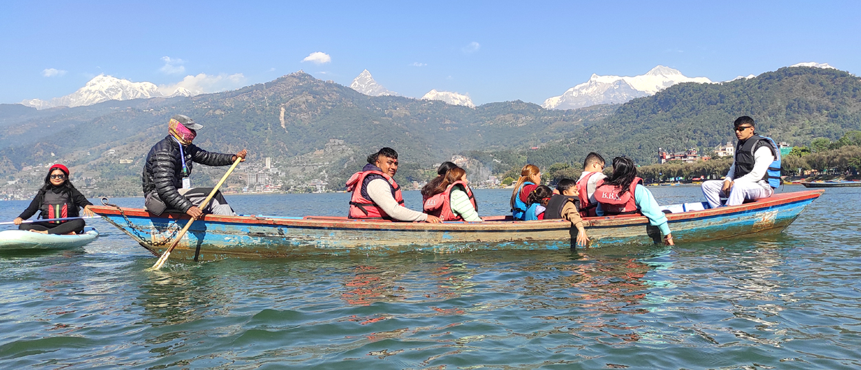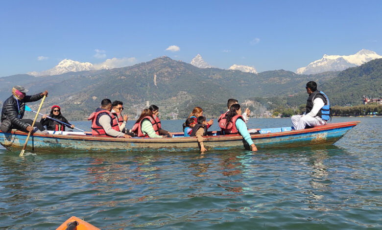 पर्यटकीय राजधानी पोखरास्थित फेवातालमा आइतबार डुङ्गा सयर गर्दै आन्तरिक पर्यटक । पर्यटकीयाम भएकाले यतिबेला पोखरा तथा आसपासका पर्यटकीय गन्तव्यहरुमा आन्तरिक तथा वाह्य पर्यटकको आवागमन बढेको छ ।