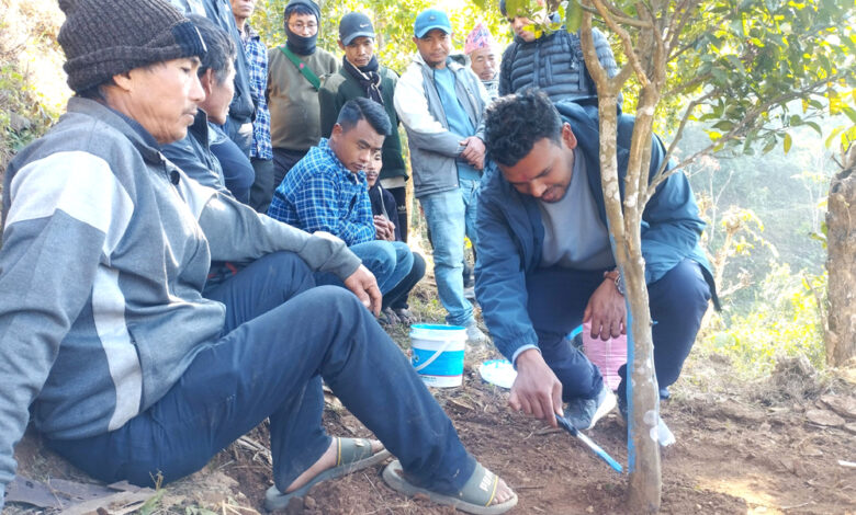 कृषि विकास कार्यालय तनहुँका कृषि प्राविधिकहरु देवघाट गाउँपालिका–२ कुवादीका कृषकहरुको खेतबारीमै पुगेर सुन्तलाजात फलफूल व्यवस्थापन सम्बन्धी जानकारी गराउँदै ।
