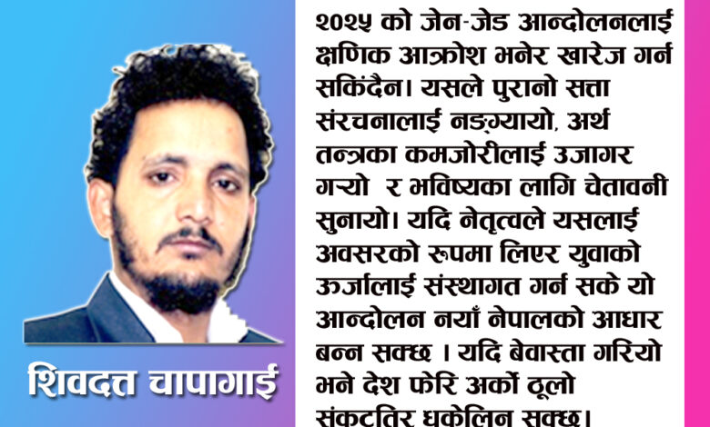 २०२५ को जेन–जेड आन्दोलनलाई क्षणिक आक्रोश भनेर खारेज गर्न सकिँदैन। यसले पुरानो सत्ता संरचनालाई नङ्ग्यायो, अर्थतन्त्रका कमजोरीलाई उजागर ग¥यो र भविष्यका लागि चेतावनी सुनायो। यदि नेतृत्वले यसलाई अवसरको रूपमा लिएर युवाको ऊर्जालाई संस्थागत गर्न सके यो आन्दोलन नयाँ नेपालको आधार बन्न सक्छ । यदि बेवास्ता गरियो भने देश फेरि अर्को ठूलो संकटतिर धकेलिन सक्छ। अन्तत जेन–जेड आन्दोलनले एउटा कठोर सत्य प्रष्ट ग¥यो भवनहरू जलेर खरानी हुन सक्छन् अर्थतन्त्र कमजोर पर्न सक्छ तर युवाको स्वर दबाउन सकिँदैन । यही स्वरमा नेपालको भोलि लेखिएको छ आशा र संकटको दोहोरो कथा जहाँ पुनर्निर्माणको बाटो पनि छ र यदि बेवास्ता गरियो भने पतनको खाडल पनि ।