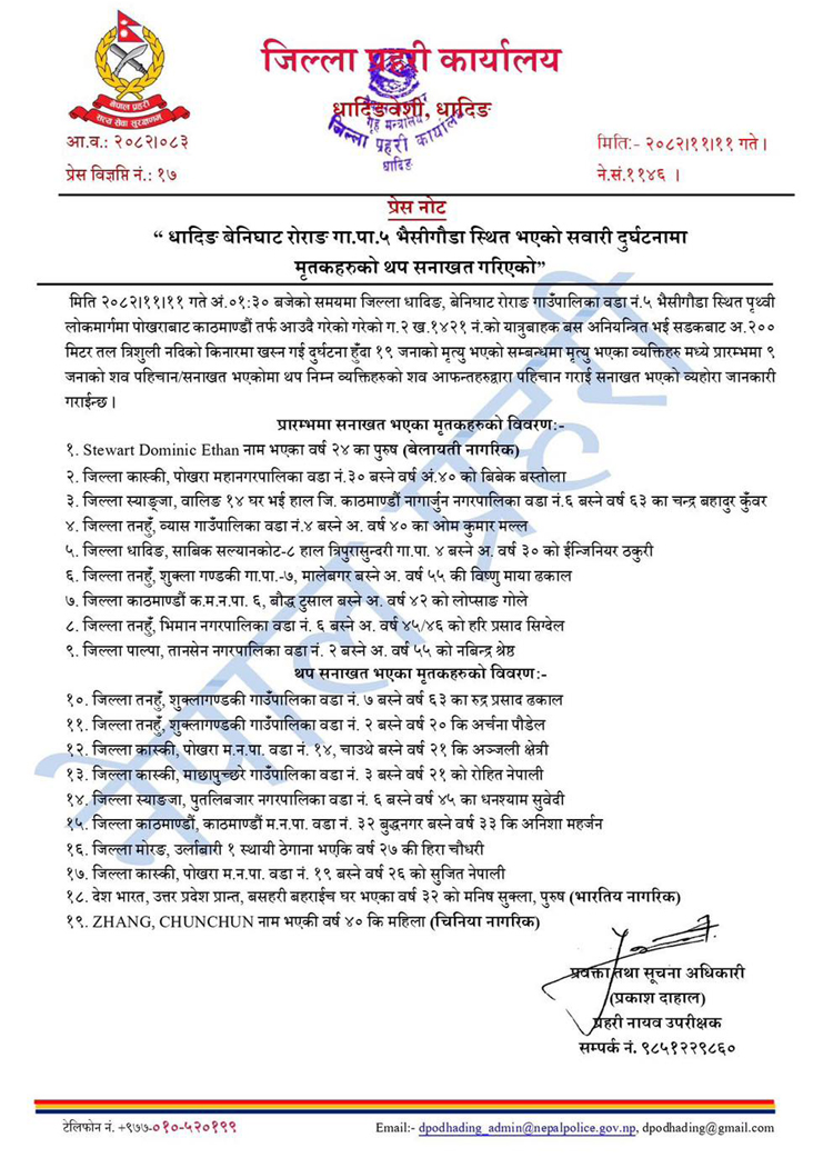 - धादिङको बेनीघाट रोराङ गाउँपालिका–५ मा भएको बस दुर्घटनामा मृत्यु भएका १९ जनाको पहिचान खुलेको छ।