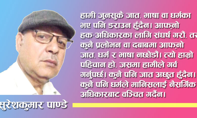 हामी जुनसुकै जात, भाषा वा धर्मका भए पनि डराउन हुँदैन । आफ्नो हक–अधिकारका लागि संघर्ष गरौँ, तर कुनै प्रलोभन वा दबाबमा आफ्नो जात, धर्म र भाषा नछोडौँ। त्यो हाम्रो पहिचान हो, जसमा हामीले गर्व गर्नुपर्छ । कुनै पनि जात अछुत हुँदैन । कुनै पनि धर्मले मानिसलाई नैसर्गिक अधिकारबाट वञ्चित गर्दैन।