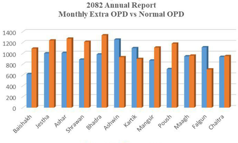 तथ्याङ्कअनुसार असोज र कात्तिक महिनामा अतिरिक्त समयमा सेवा लिनेको संख्या उल्लेख्य रूपमा बढेको देखिन्छ। हाल अस्पतालले कार्यालय खुल्ने दिन बिहान ७ बजेदेखि १० बजे र दिउँसो २ बजेदेखि बेलुकी ८ बजेसम्म तथा सार्वजनिक बिदा र शनिबार पनि बिहान ७ बजेदेखि बेलुकी ८ बजेसम्म सेवा प्रदान गर्दै आएको छ । यो विवरण इमर्जेन्सी विभाग बाहेकको हो । विस्तारित ओपिडी सेवाले स्थानीय तहमा स्वास्थ्य सेवालाई पहुँचयोग्य बनाउँदै उदाहरणीय अभ्यासको रूपमा स्थापित हुँदै गएको छ ।