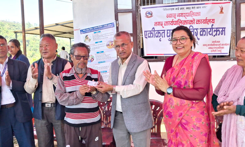 तनहुँको व्यास नगरपालिका–१४ केशवटारमा मंगलबार आयोजित एकीकृत घुम्ती शिविरमा सेवाग्राहीलाई राष्ट्रिय परीचयपत्र हस्तान्त्ररण गर्दै नगरप्रमुख बैकुण्ठ न्यौपाने । शिविर शुभारम्भ गर्दै नगर प्रमुख न्यौपानेले जनताको सहजताका लागि वडामै पुगेर सेवा प्रदान गर्ने उद्देश्यले शिविर सञ्चालन गरिएको बताए । नगरबासीलाई घर गाउँमै विभिन्न सरकारी सेवा उपलब्ध गराउने लक्ष्यका साथ एकीकृत घुम्ती शिविरलाई प्रभावकारी बनाइएको उनले बताएका छन्। शिविरमार्फत नगरपालिकाबाट प्रदान गरिने व्यक्तिगत घटना दर्ता, सामाजिक सुरक्षा भत्ता सम्बन्धी सेवा, स्वास्थ्य परीक्षण, कृषि तथा पशु सेवा, महिला तथा बालबालिका सम्बन्धी परामर्श, राजस्व संकलन, राष्ट्रिय परीक्षणपत्र लगायतका सेवा प्रदान गरिएको नगरपालिकाले जनाएको छ । तस्विर : भञ्ज्याङ