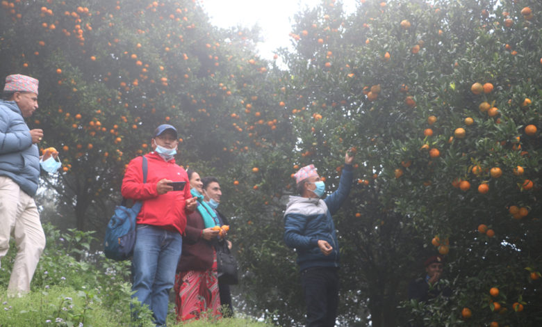 तनहुँको म्याग्दे गाउँपालिका वडा नं. १, २ र ३ को उमाचोक सुन्तला ब्लक संचालक समितिको सुन्तला खेती अनुगमन गर्न पुगेका जनप्रतिनिधि र कार्यालयप्रमुखहरु । कृषि ज्ञान केन्द्र तनहुँले यहाँका कृषकहरुलाई ब्लकमा सुन्तला खेती कार्यक्रममा सघाएको छ । यहाँका कृषकहरुले यस वर्ष सुन्तला बिक्री वितरणबाट करिब ३ करोड रुपैयाँ बराबरको आम्दानी गर्ने लक्ष्य लिएका छन्। तस्विर : नारायण खड्का/भञ्ज्याङ